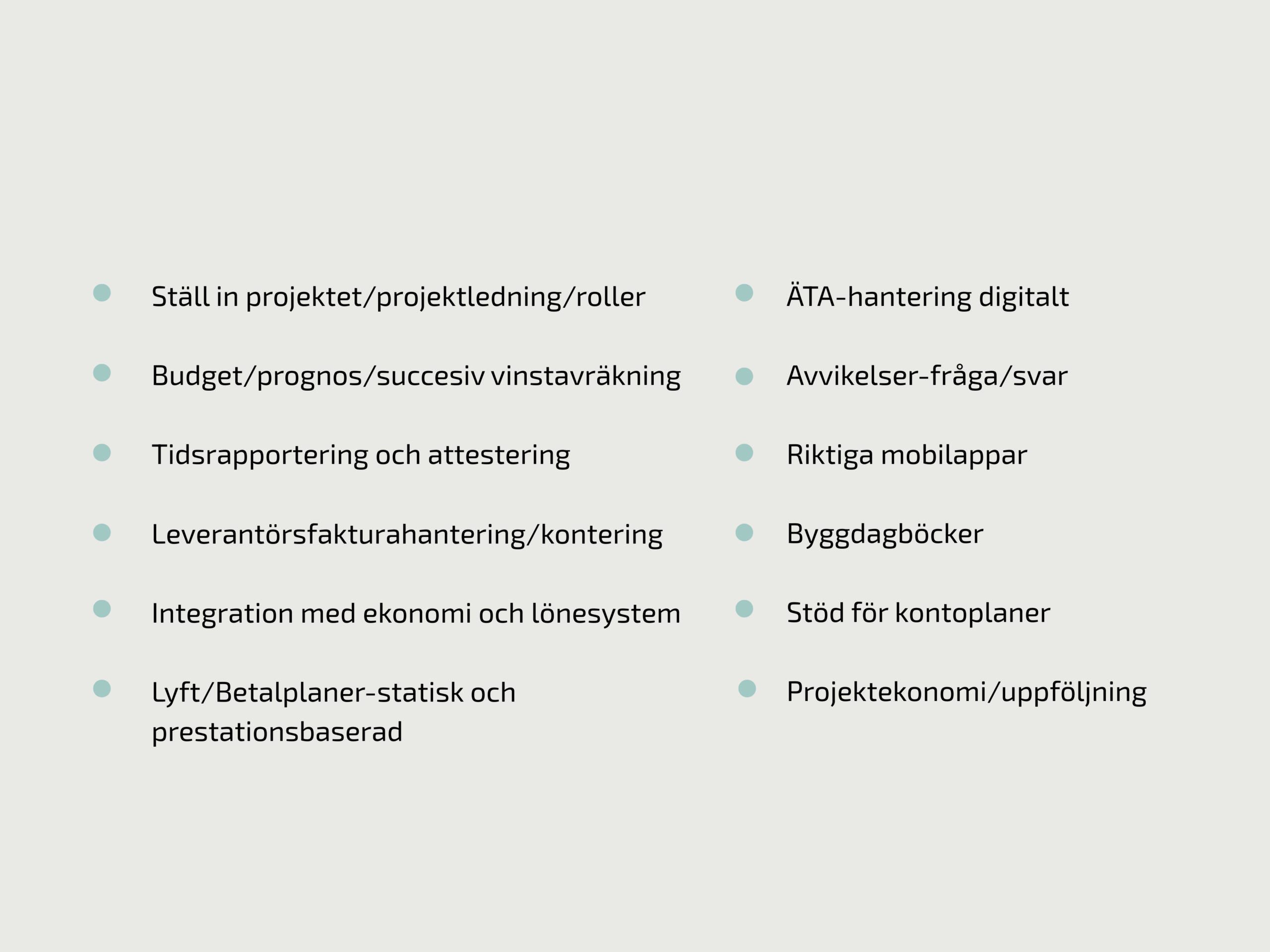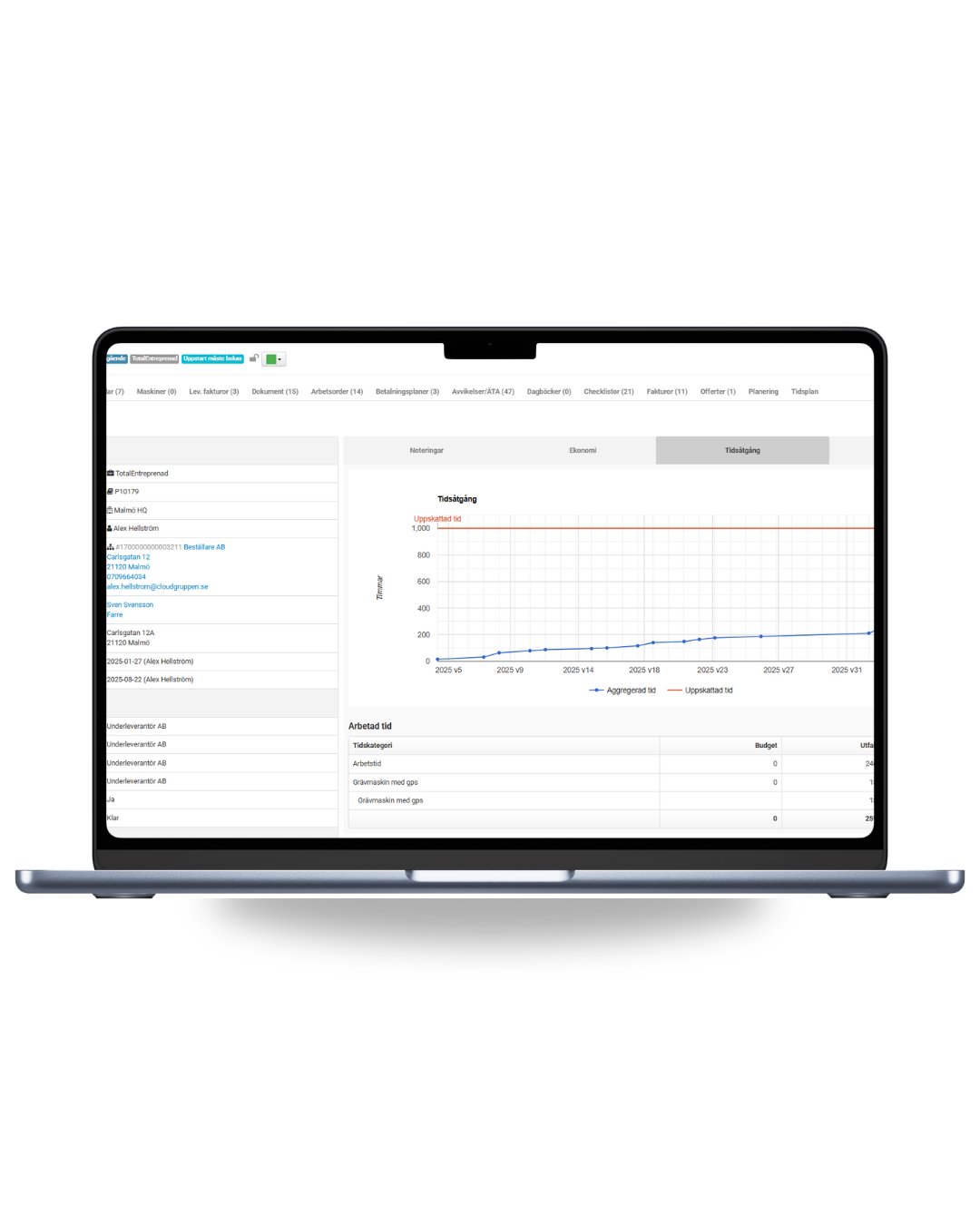 En kraftfull modul som innehåller allt för dina entreprenader. Funktioner som lyft-betalplaner, olika budgetverktyg, ÄTA-avvikelser. Möjlighet att skapa underprojekt/arbetsordrar kopplade till huvudprojektet. Full kontroll över tidsrapportering, dokumentation och tidsplaner för att nämna några av funktionerna.