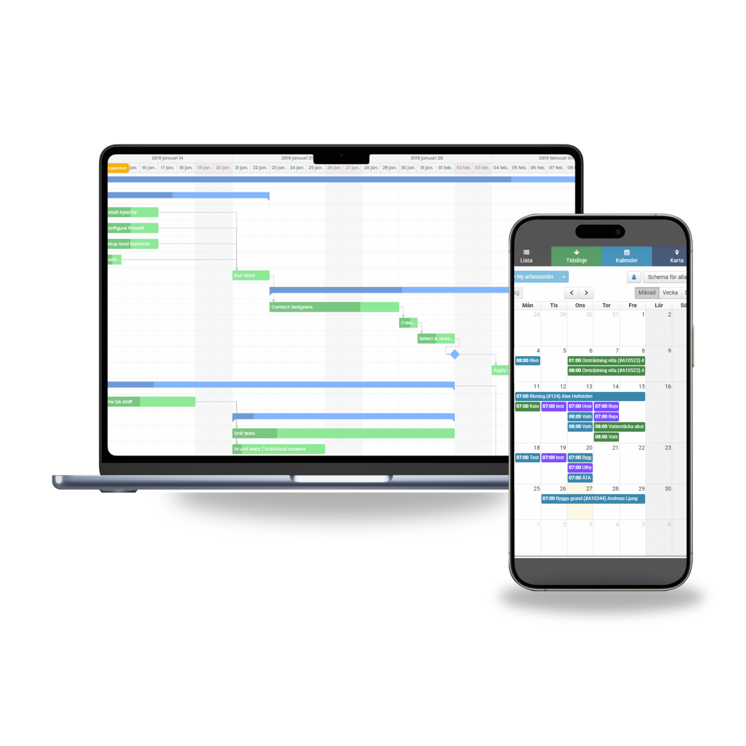 Du har möjlighet att göra detaljerade tidsplaner i cloud work. Skapa flera stycken i samma projekt. Varför inte en för beställare, en för er själva och en för era underleverantörer. Ni bestämmer själva. Integrera resursplaneringen med era vanliga kalenderappar så som Microsoft eller google.