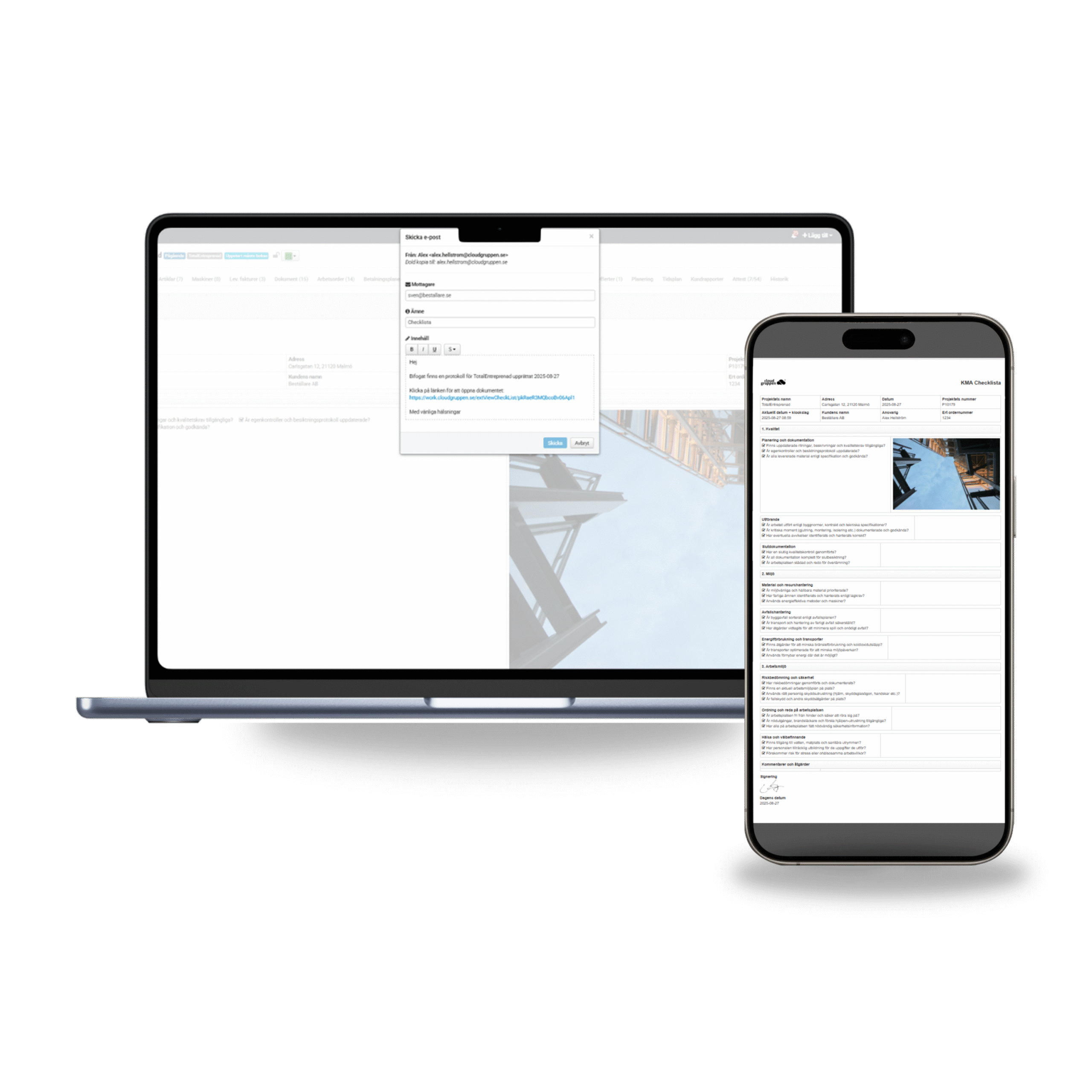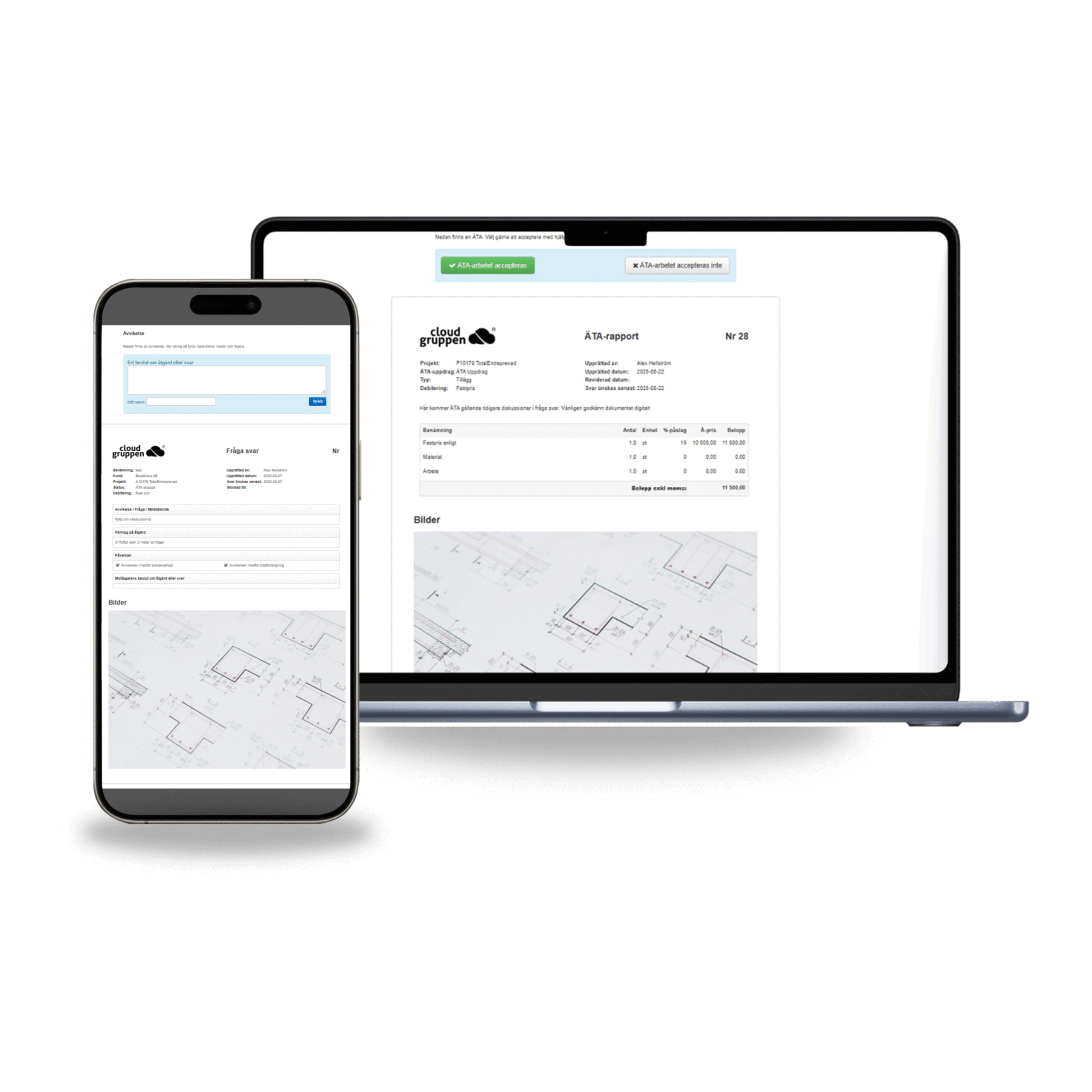 Kommunicera direkt med era beställare från Cloud work. Ni skapar enkelt upp avvikelser/fråga svar och ÄTA, skicka direkt för signering. Möjlighet att bifoga externa dokument/underlag, timmar, leverantörsfakturor m.m. Allt samlat på ditt projekt i Cloud work.