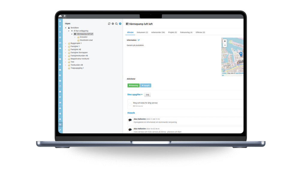 Med ett smart objektsregister får du total överblick över alla kunders anläggningar. Se historik, serviceintervall och utförda arbeten på varje objekt – allt samlat på ett ställe. Det gör det enkelt att planera underhåll, minska felrisker och leverera snabb, träffsäker service varje gång.